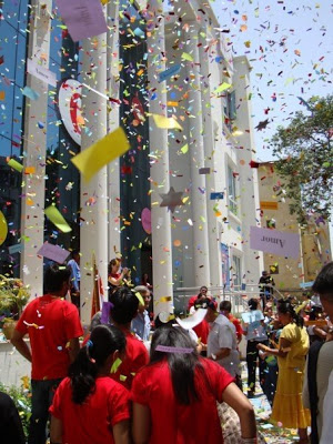 Immediately after the welcome address, the entrance area of Center’s premises was filled with a spectacular “shower of words”. The most popular Spanish words “amor”, “beso”, “chocolate”, “fiesta”, “Sonrisa” etc. chosen by the students were launched through special canon fixed at the roof of the four storied building of Instituto Cervantes.